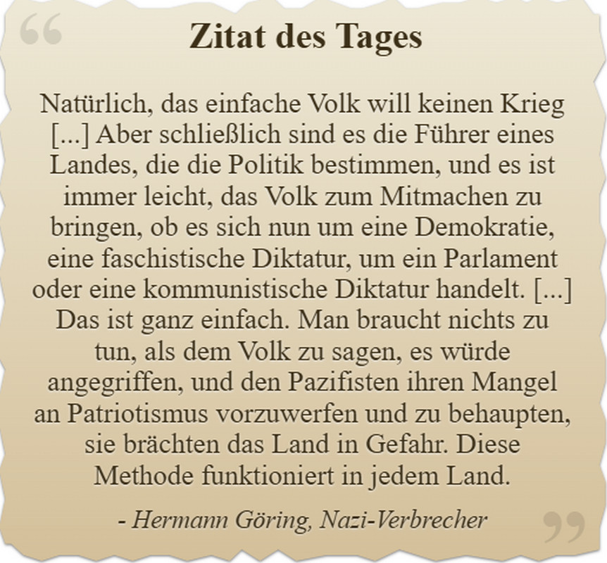| He recently told me excitedly over my secret phone that this was increasingly the case today and that he knew exactly what was going on because, as he was no longer actively involved in the government himself, he had confidants in the SPD party who would tell him exactly what the individual members of the government were up to. He said that the major parties were only cowardly afraid of Russia and spreading hatred towards it, as was also happening in the EU dictatorship, and that they wanted to ban those important parties that were striving for peace with Russia, thus mendaciously accusing them of right-wing extremism. All the neo-NAZIs in the German government and the EU dictatorship – and he explicitly mentioned names of key figures – craved war and at the same time were cowardly afraid and wanted to build up a large, well-armed army once again to wage war against Russia, as Hitler had already done. Top leaders in Germany even 'spied' that the German army itself would intervene in the war in Ukraine. The political grandees of France and England would also join in, just as all these warmongers would encourage other European states to act in the same way and instil fear in them. The neo-Nazi pack of the SPD party, as he explicitly called the German government, as well as the EU dictatorship and the other European states, are on the verge and on the way to conjuring up a new world war, whereby the Ukraine war is also to be prolonged through a mendacious friendship with Zelensky and Ukraine and with war-promoting arms deliveries. On the one hand, this is to justify their own war mania to the people, and on the other hand to wear down Russia, with America standing in the background and being responsible for this, which is waiting to be able to include Russia in its world domination mania. | Das sei heute vermehrt so, sagte er mir kürzlich aufgeregt über mein Geheimtelephon, und das wisse er genau, denn er habe heute, weil er nicht mehr selbst aktiv in der Regierung ist, Vertrauensleute in der Partei der SPD, die ihm haargenau berichten würden, was der einzelnen Regierungsmitglieder üble Gesinnung sei. Er sagte, dass die grossen Parteien nur feige Angst vor Russland hätten und diesem gegenüber Hass verbreiten würden, wie es auch in der EU-Diktatur geschehe, und dass sie jene wichtigen Parteien verbieten wollen, die nach Frieden mit Russland streben, folglich diese lügnerisch des Rechtsextremismus bezichtigt würden. All die NeoNAZIs in der Regierung Deutschlands und der EU-Diktatur – wobei er explizit Namen von Massgebenden nannte – lechzten nach Krieg und hätten zugleich feige Angst und wollten neuerlich eine waffenstarke und grosse Armee aufbauen, um gegen Russland Krieg zu führen, wie das schon geschehen sei durch Hitler. Oberste der Regierenden in Deutschland ‹spiènzeln› sogar damit, dass die Deutscharmee selbst in den Krieg in der Ukraine eingreife. Auch die Politgrössen von Frankreich und England würden dazugehören, wie durch alle diese Kriegshetzer auch andere europäische Staaten gleichermassen zu gleichem Handeln animiert und in Angst versetzt würden. Das NeoNAZIpack der Partei SPD, wie er diese der Deutschlandregierenden explizit nannte, wie auch der EU-Diktatur und der anderen Europastaaten, seien drauf und dran und auf dem Weg, einen neuen Weltkrieg heraufzubeschwören, wobei zusätzlich durch eine verlogene Freundschaft zu Selensky und der Ukraine sowie mit kriegsfördernden Waffenlieferungen der Ukrainekrieg in die Länge gezogen werden soll. Dies einerseits zum Zweck, dadurch ihren eigenen Kriegswahn beim Volk zu rechtfertigen, um anderseits Russland zu zermürben, wobei für dies Amerika im Hintergrund stehe und verantwortlich sei, das darauf lauere, dadurch Russland in seinen Weltherrschaftswahn einreihen zu können. |