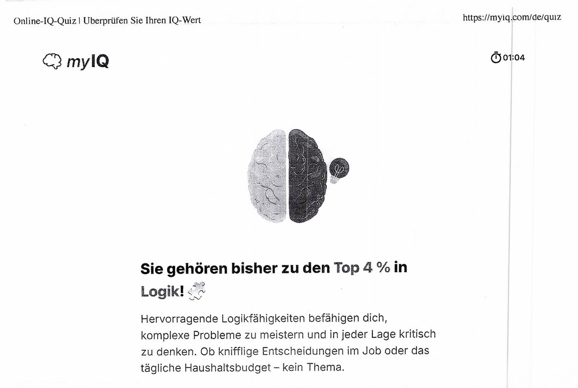 Oh, it is nothing important. – I just did a short IQ test of my reaction speed and logic on the computer. That is an expression of it. Ach, das ist nichts Wichtiges. – Da habe ich einfach einmal im Computer einen kurzen angebotenen IQ-Test meiner Reaktionsschnelligkeit und Logik gemacht. Das ist ein Ausdruck davon.